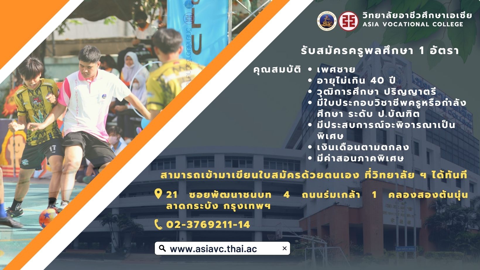 วิทยาลัยอาชีวศึกษาเอเซีย รับสมัครครูพลศึกษา 1 อัตรา