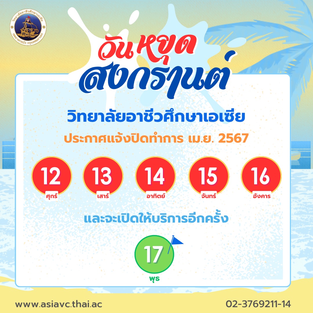 วิทยาลัยอาชีวศึกษาเอเซีย ประกาศแจ้งปิดทำการ เม.ย 67 วันหยุดสงกรานต์ ตั้งแต่วันที่ 12 - 16 เม.ย. 67 -เปิดทำการวันพุธที่ 17 เมษายน 2567