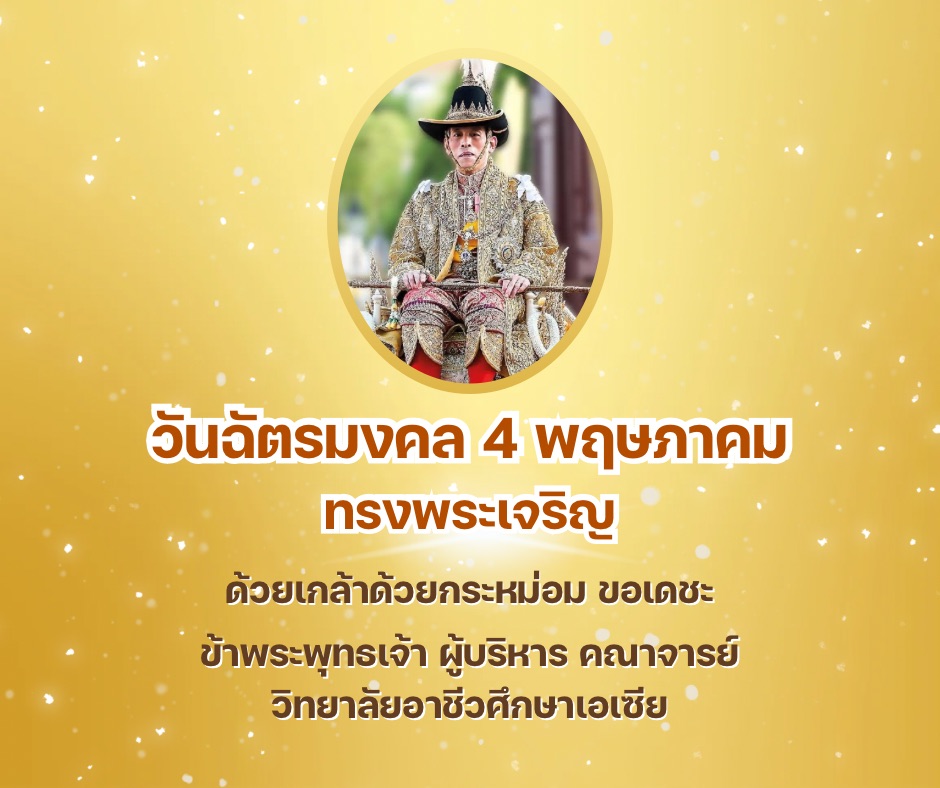 "ทรงพระเจริญ" เนื่องในโอกาสวันฉัตรมงคล 4 พฤษภาคม ด้วยเกล้าด้วยกระหม่อม ขอเดชะ ข้าพระพุทธเจ้า ผู้บริหาร คณาจารย์วิทยาลัยอาชีวศึกษาเอเซีย
