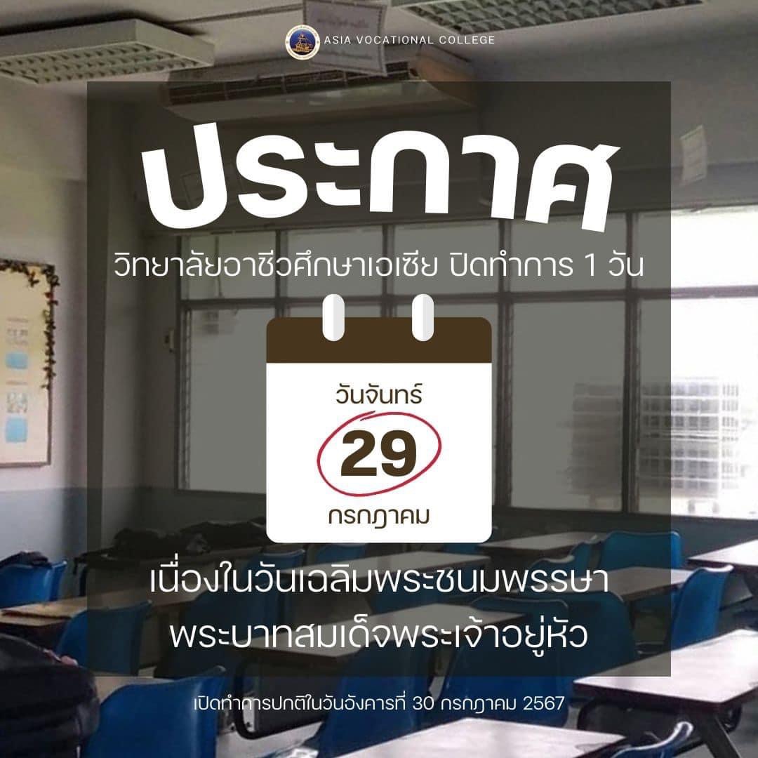 วิทยาลัยอาชีวศึกษาเอเซีย แจ้งปิดทำการ 1 วัน วันจันทร์ที่ 29 กรกฎาคม 2567 เนื่องในวันเฉลิมพระชนมพรรษาพระบาทสมเด็จพระเจ้าอยู่หัว