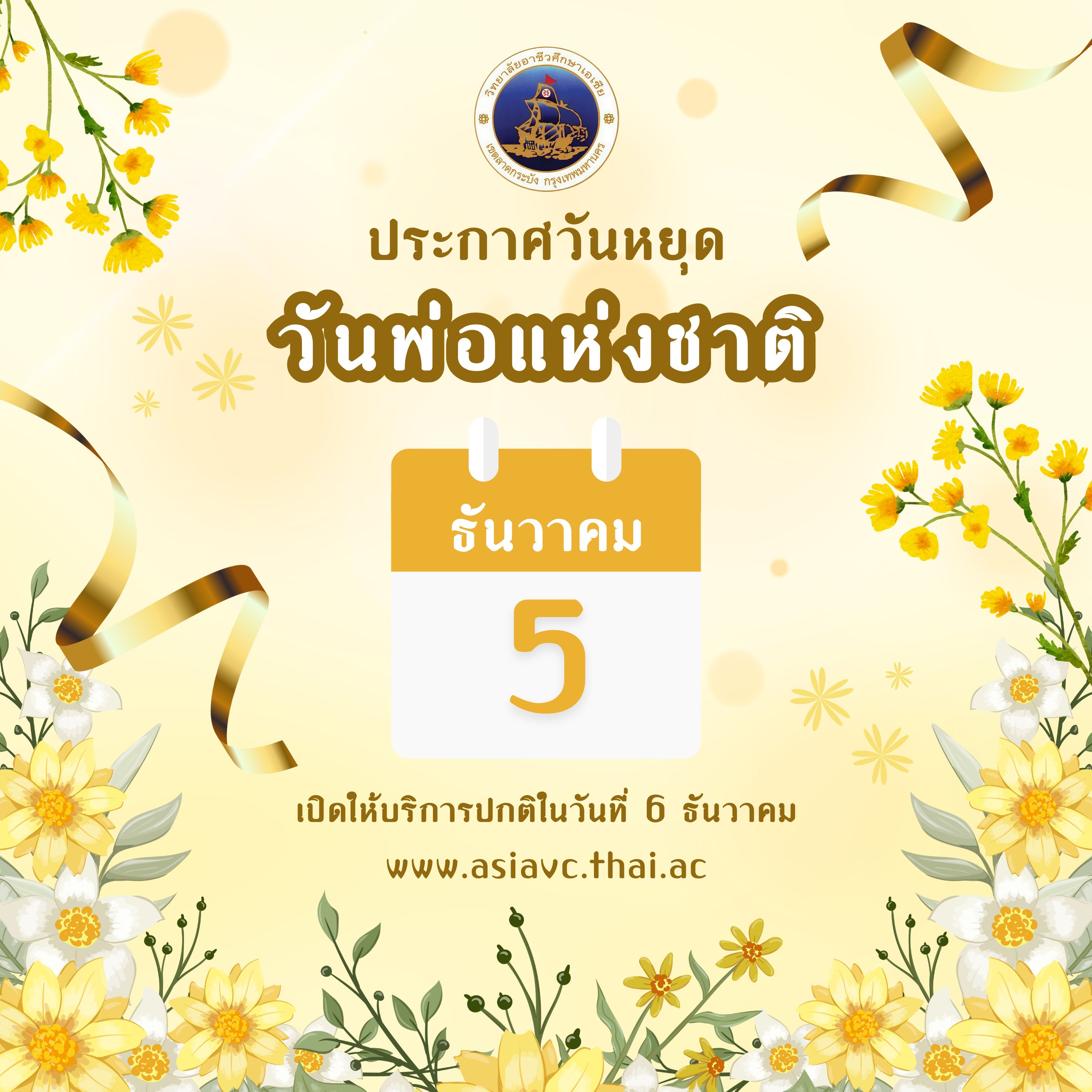วิทยาลัยอาชีวศึกษาเอเซีย ขอแจ้งประกาศวันหยุด วันพ่อแห่งชาติ วันที่ 5 ธันวาคม