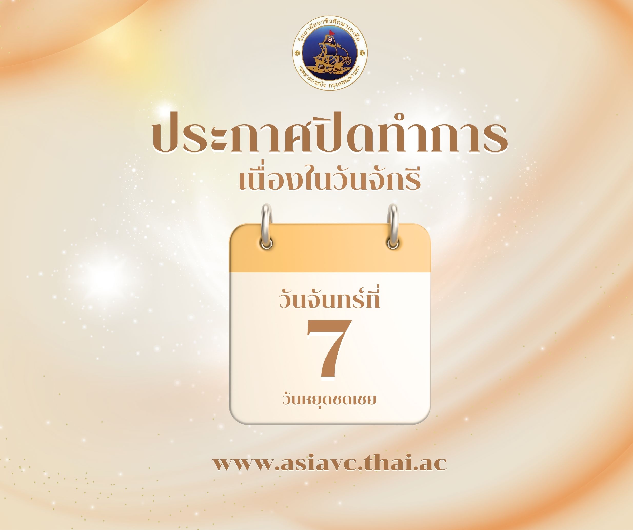 ประกาศปิดทำการเนื่องในวันจักรี วิทยาลัยอาชีวศึกษาเอเซีย ปิดทำการในวันจันทร์ที่ 7 เมษายน 2568 เนื่องในวันหยุดชดเชยวันจักรี