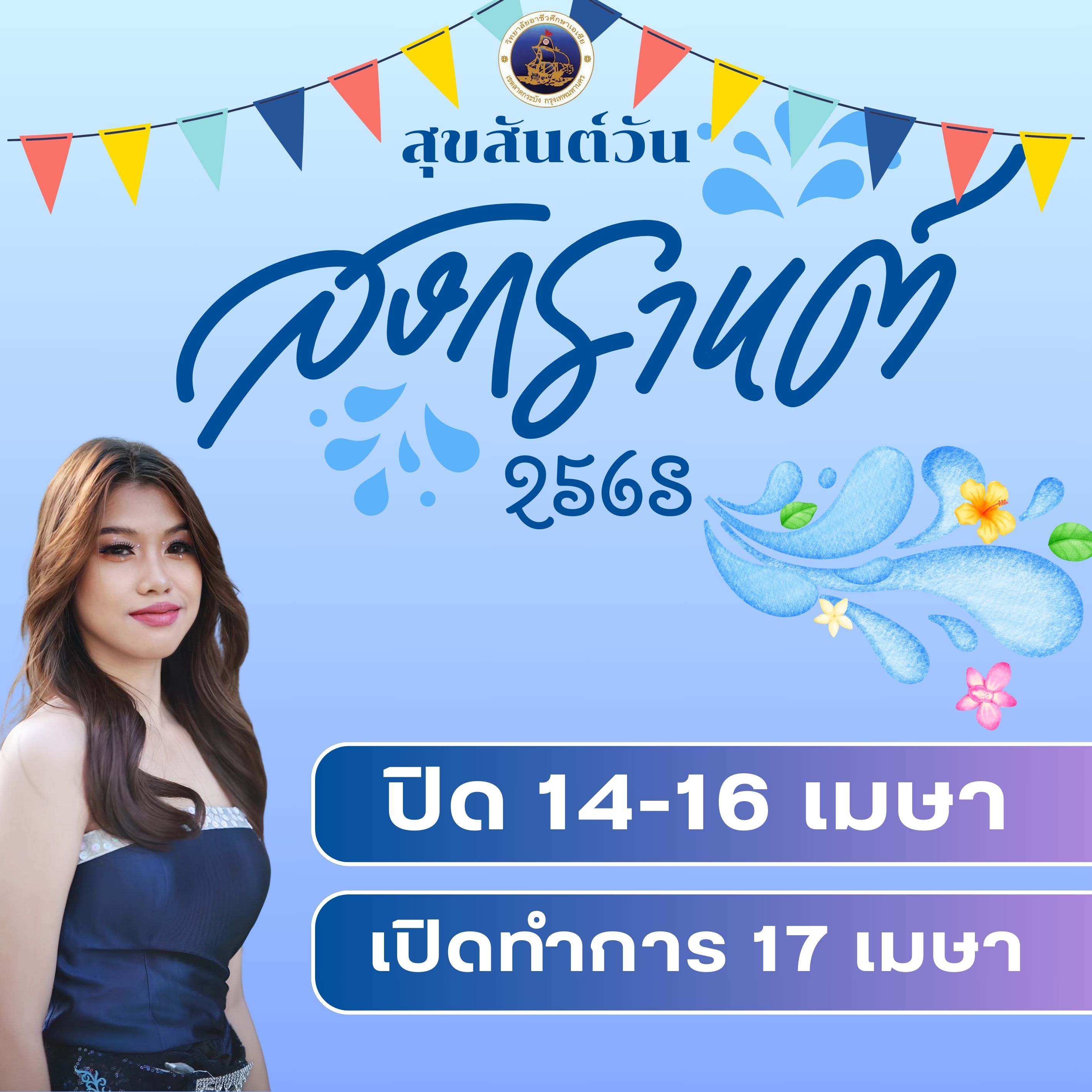 สุขสันต์วันสงกรานต์ 2568 วิทยาลัยอาชีวศึกษาเอเซีย หยุดทำการวันที่ 14-16 เมษายน และจะเปิดทำการตามปกติในวันที่ 17 เมษายน เป็นต้นไป