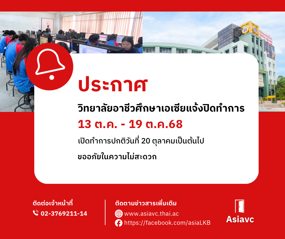 ประกาศจากวิทยาลัยอาชีวศึกษาเอเซีย ปิดทำการระหว่างวันที่ 13-19 ตุลาคม 2568 และจะเปิดทำการตามปกติในวันที่ 20 ตุลาคม 2568 เป็นต้นไป