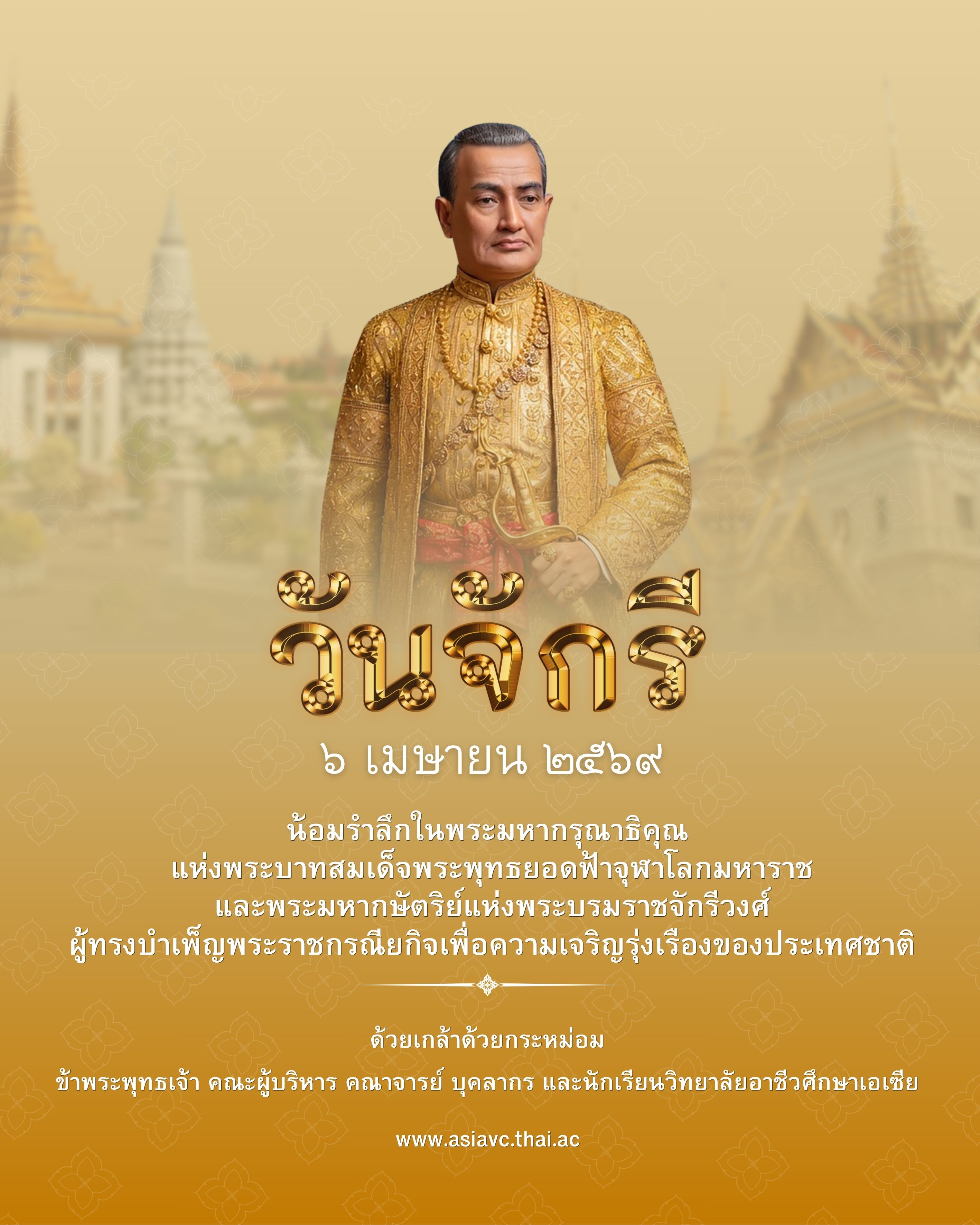 6 เมษายน วันจักรี น้อมรำลึกในพระมหากรุณาธิคุณ แห่งพระบาทสมเด็จพระพุทธยอดฟ้าจุฬาโลกมหาราช และพระมหากษัตริย์แห่งพระบรมราชจักรีวงศ์