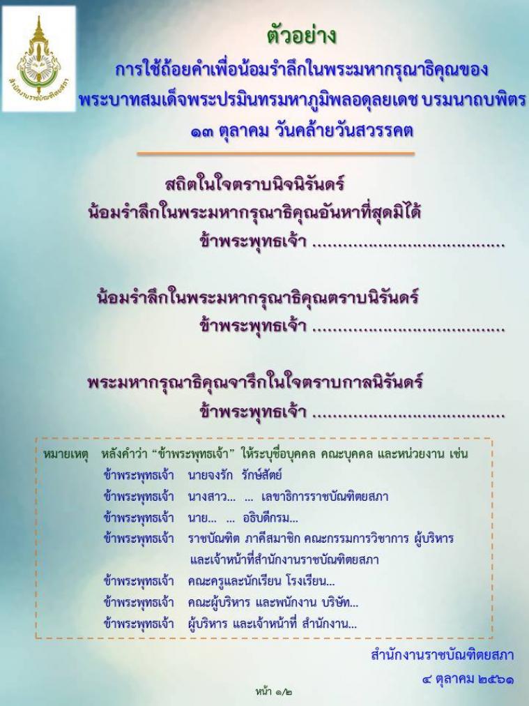 เผยแพร่การใช้ถ้อยคำเพื่อน้อมรำลึกพระมหากรุณาธิคุณของ พระบาทสมเด็จพระปรมินทรมหาภูมิพลอดุลยเดช บรมนาถบพิตร ๑๓ ตุลาคม วันคล้ายวันสวรรคต