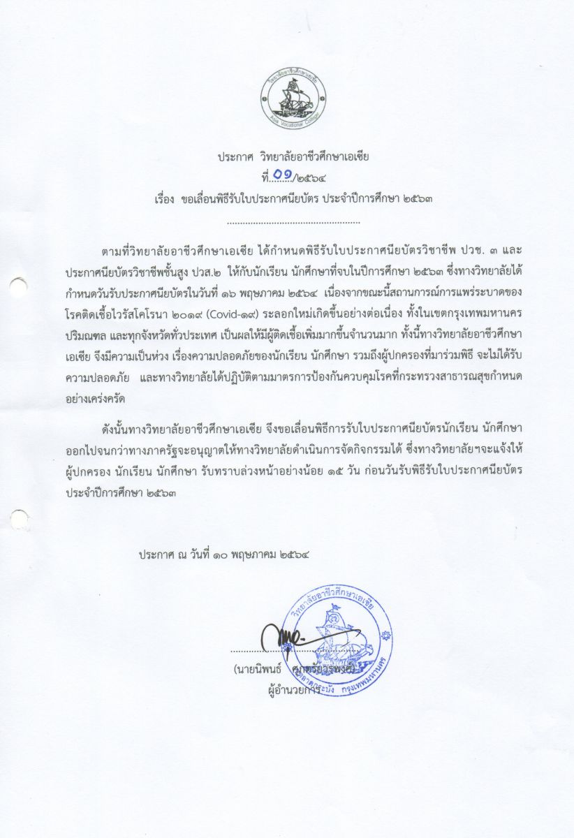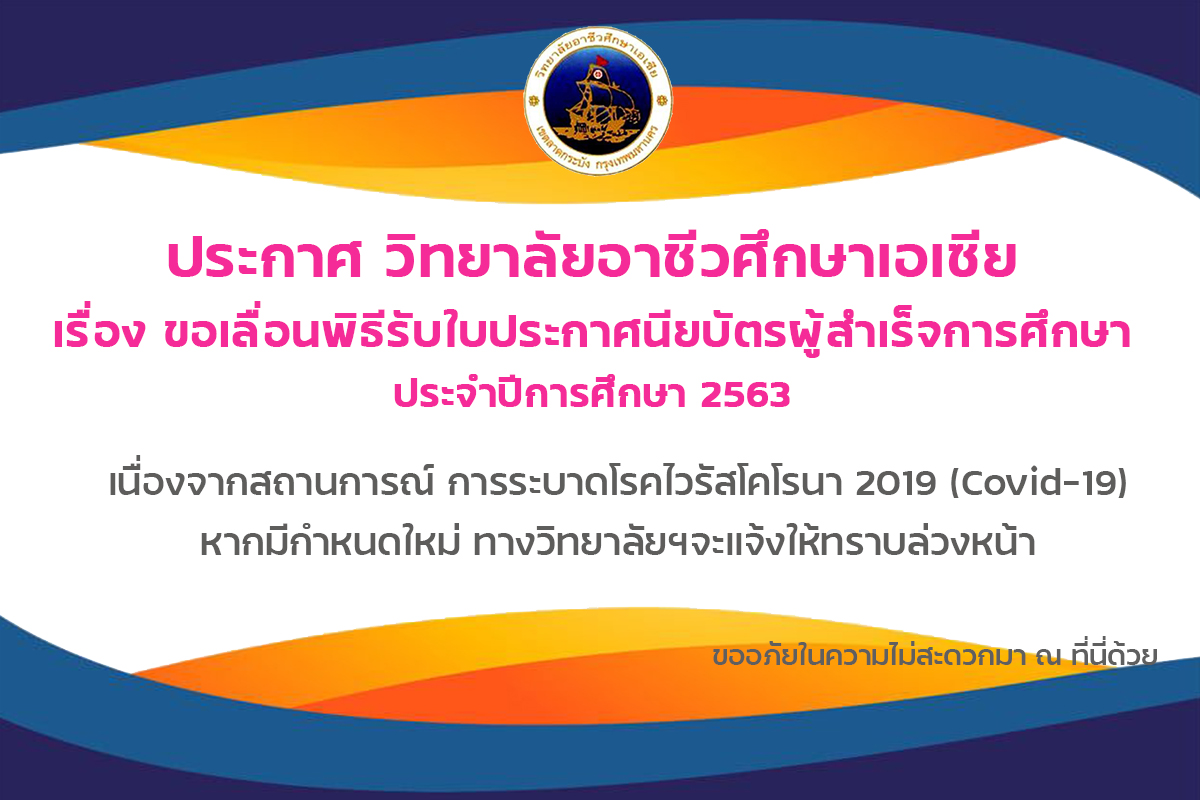 ประกาศ วิทยาลัยอาชีวศึกษาเอเซีย เรื่อง ขอเลื่อนกำหนดการพิธีรับใบประกาศนียบัตรผู้สำเร็จการศึกษา ประจำปีการศึกษา 2564