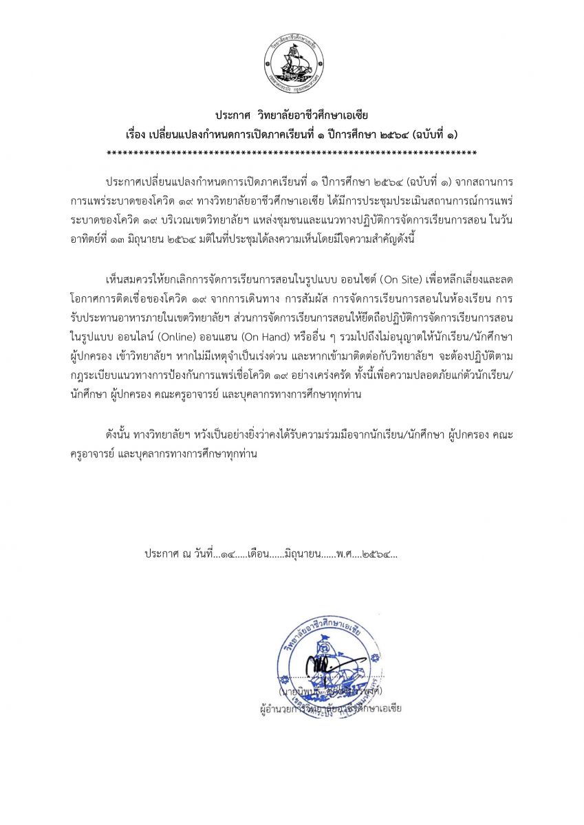 ประกาศ เรื่อง เปลี่ยนแปลงกำหนดการเปิดภาคเรียนที่ 1 ปีการศึกษา 2564 (ฉบับที่ 1)