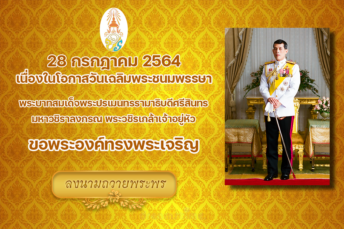 วันที่ 28 กรกฎาคม 2564  เนื่องในโอกาสวันเฉลิมพระชนมพรรษา พระบาทสมเด็จพระปรเมนทรรามาธิบดีศรีสิน?ทรมหาวชิราลงกรณ พระวชิรเกล้าเจ้าอยู่หัว ทรงเป็นพระมหากษัตริย์ที่เปี่ยมด้วยพระอัจฉริยภาพและความสามารถ พระองค์ทรงอุทิศพระวรกายในการประกอบพระราชกรณียกิจ เพื่อเป็นการเฉลิมพระเกียรติและร่วมแสดงความจงรักภักดี ขอเชิญชวนผู้บริหาร ครู บุคลากร นักเรียน นักศึกษา ลงนามถวายพระพรออนไลน์ได้ที่